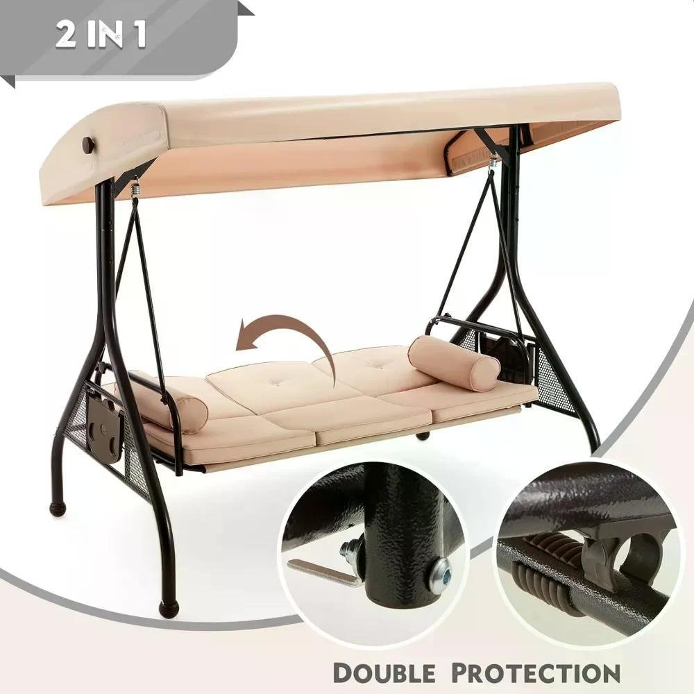 About this item [660LBS STABLITY]HOMERST porch swing is constructed from all-metal frame. The metal pipe fittings on the top, sturdy hook and thickened seat tube can provide a capacity of 660LBS.Heavy springs connect the swing to the frame, ensuring a smooth, gentle rocking motion.We pay attention to the safety of consumers. [2 IN 1 DESIGN]With a simple operation,releasing the spring locks on both sides and the Backrest will fall down.Then buckle the flat Backrest on the anti-slip buckle gently, it and the limit stop will provide double protection during your leisure time.The outdoor swing chair can be turned into a flat bed. [3 SEATERS]Whether the spacious seat space or the thickened cushion, both reflect that you can get a comfortable experience from the outdoor swings.In particular, the sophisticated manufacturing process of the patio swings ensures that there will be no annoying noise during using it. [45 DEGREES CANOPY]The swing canopy is made of thicker material.The enlarged adjustable rotary knob helps you to adjust the angle of the swings canopy easily, and protects you from rain and UV rays.You can use the patio hammock swing in all kinds of weather.If you want to do sunbathing,just remove the canopy. [Considerate Service]: If you have any questions, please contact us and we will solve it for you as soon as possible. I wish you a happy shopping!