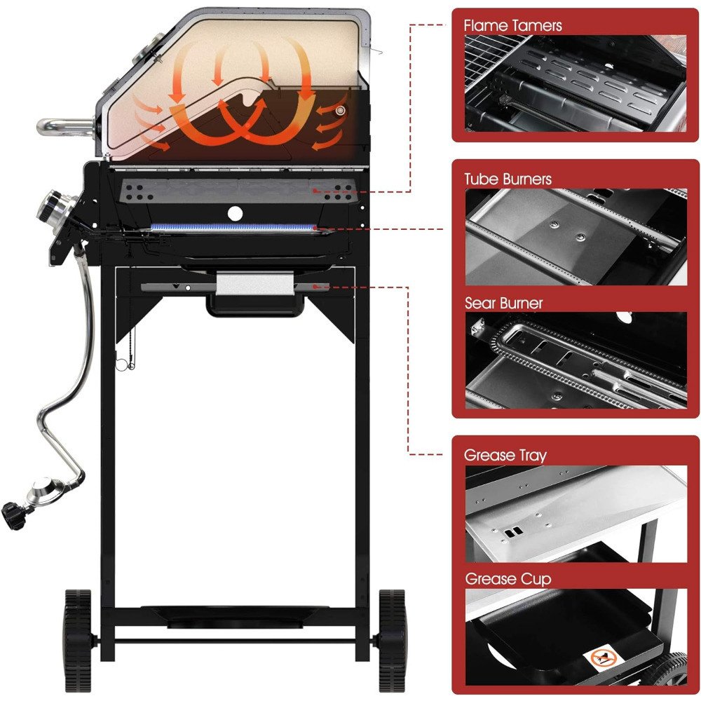 About this item Ample Cooking Space: Total of 632 sq. in. cooking space, including 483 sq. in. porcelain-enameled cast iron cooking grates and 149 sq. in. chrome-plated steel warming rack provides ample cooking area for about 29 hamburgers at the same time. Sear Burner & Side Burner: Sear burner generates 14,000 BTU to provide strong performance for quick and even heat distribution; lidded side burner offering 10,000 BTU is ideal for cooking side dishes and sauces. Reliable electronic ignition system offers quick start-up with the simple push of a button and speeds up the inner heat delivering. Durable and Solid Construction: The stylish grill is made of heavy stainless steel, featuring durable control panel and double-layer lid with heat-resistant handle and built-in thermometer, which is built to longtime use. The built-in temperature gauge provides real-time and accurate heat monitoring and control to make your delicacies have best flavors. Hassle-free Cleanup: Equipped with removable grease tray and grease cup to help reduce the risk of flare-ups. It's very easy to slide out and dump residues, thereby simplifying the cleanup procedure. High Performance: This propane gas grill has 4 main burners (10,000 BTU each), a sear burner (14,000 BTU) and a lidded side burner (10,000 BTU). 6 stainless steel burners offer a total of 64,000 BTU output for delivering even heat.