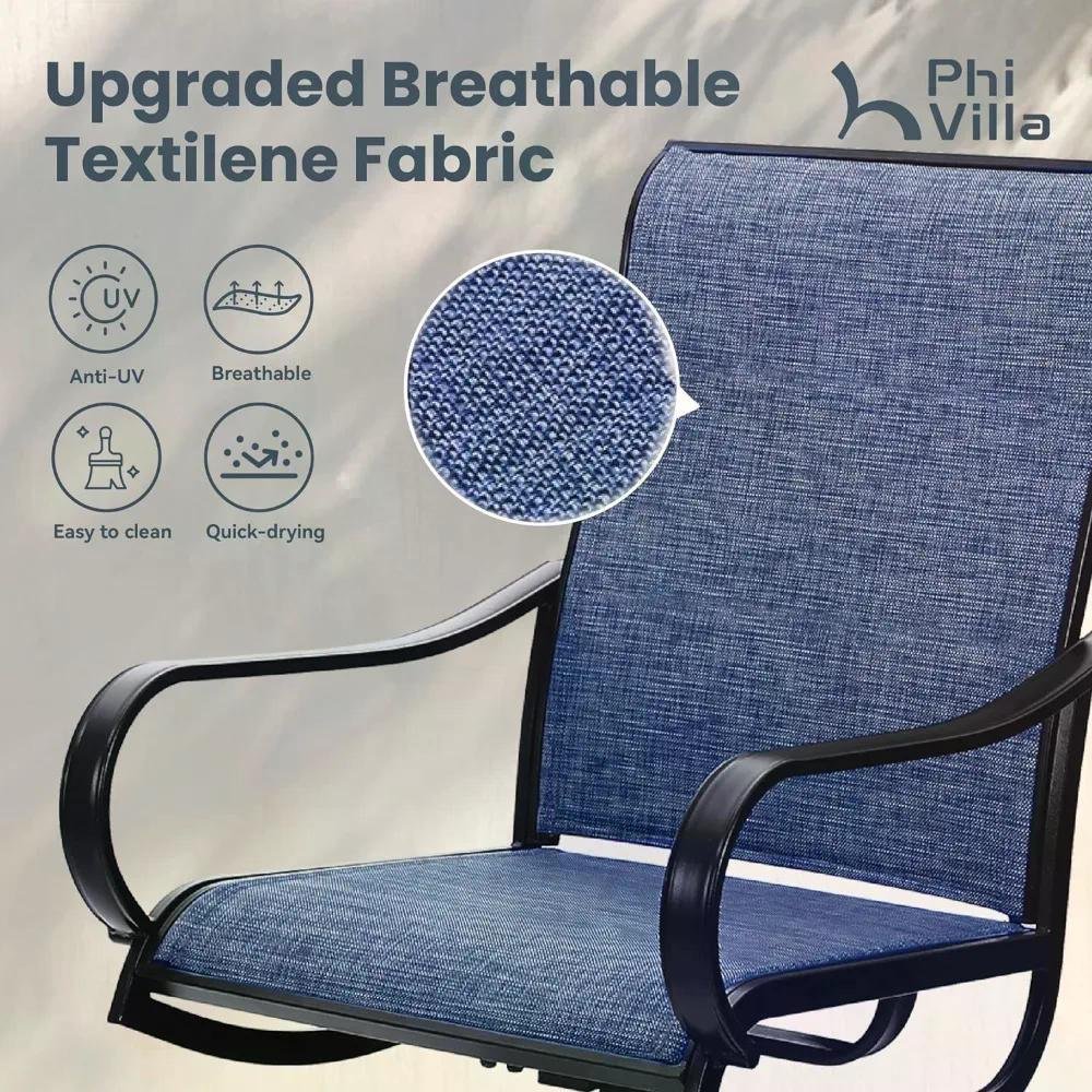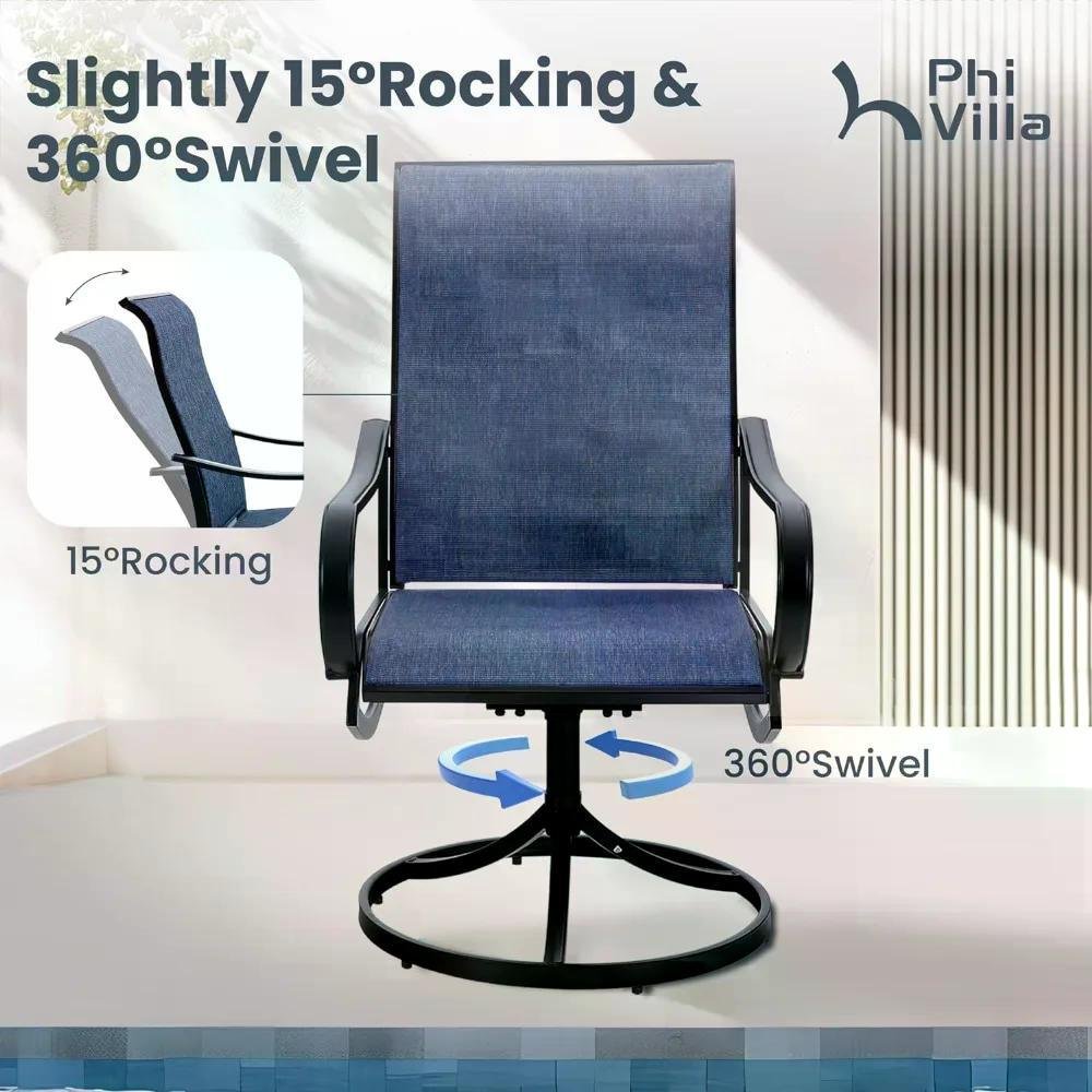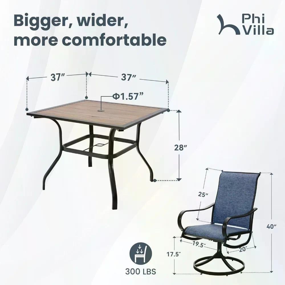 About this item 360-Degree Swivel & Rocking:This outdoor rocking chair supports 360-degree rotation and gental rocking. The round, swivel base and extra wide seat design make the chair more stable Premium Textilene Seat and Back: The chair seat and back use high density textilene mesh fabric mixed with olefin which not only comfortable but breathable, easy-to clean and long-lasting for all weather Square Outdoor Dinning Table: Features metal steel frame with special PVC wood-look table top design, easy to clean. In addition, there is an umbrella hole, give you more choices Durable & Sturdy: The chairs and table are made of premium metal steel with E-coating, so it is more sturdy and rust-resistant. The chairs holds up to 300 lbs weight capacity for long-lasting use. Chairs & Table Dimension: Chairs: 19.5"W x 20"D x 40"H, Table: 37"W x 37"D x 28"H (1.57" Umbrella Hole ),Each package coming with clear instructions and all necessary accessories.