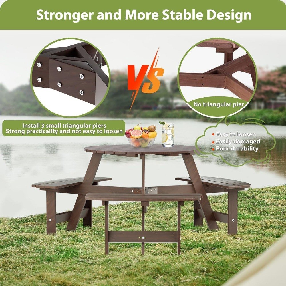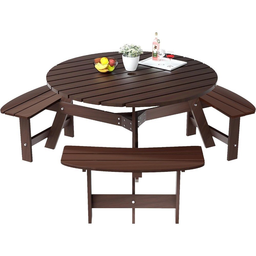 About this itemWoodSpacious outdoor table and chairs: With its 35-inch large round tabletop, round 6 people picnic tables for outdoors,this picnic bench offers a generous dining space, ensuring that guests have ample room to enjoy their meals comfortably.Accommodate 6 People: Round 6 people bench outdoor, the set features 3 arc-shaped benches, meticulously crafted to easily and comfortably seat up to 6 individuals, making it perfect for gatherings of family and friends.High-Quality Pine Wood Construction: Made from pine wood, this outdoor dining set is not only robust but also boasts high strength and crack resistance, ensuring longevity and consistent performance over time.Built-in Umbrella Hole: The Round picnic tables is designed with a 2-inch diameter hole, making it compatible with most umbrellas, a feature that ensures you can enjoy outdoor dining without the harsh sun or light drizzles bothering you.Safety First Design: 6 person picnic tables for outdoors, rounded edges of the table prevent accidental bumps and injuries, making it a safe choice for both adults and kids, ensuring peace of mind during your outdoor leisure moments.