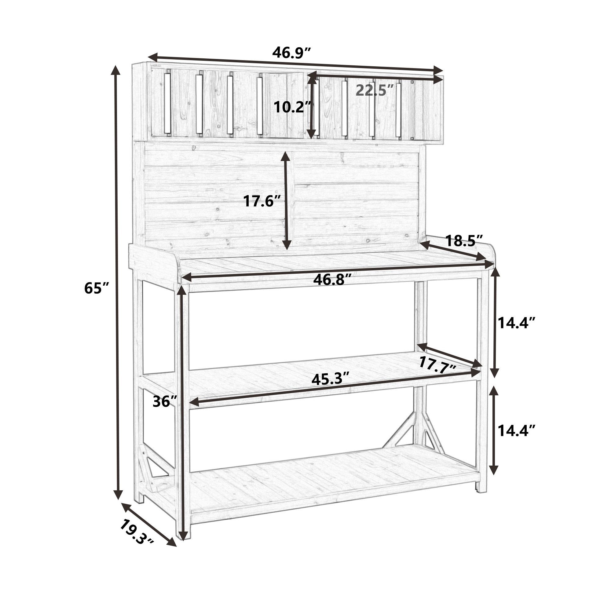 Spacious WorkstationWho's ready for Spring? Get a little bit of inspiration for the coming season from this farmhouse garden potting bench. Made of 100% fir wood; this table is sturdy enough for outdoor using with its 46.8x18.5inch workstation. Compared with other potting bench; its surface is spacious for putting many tools or planters from your loved garden.