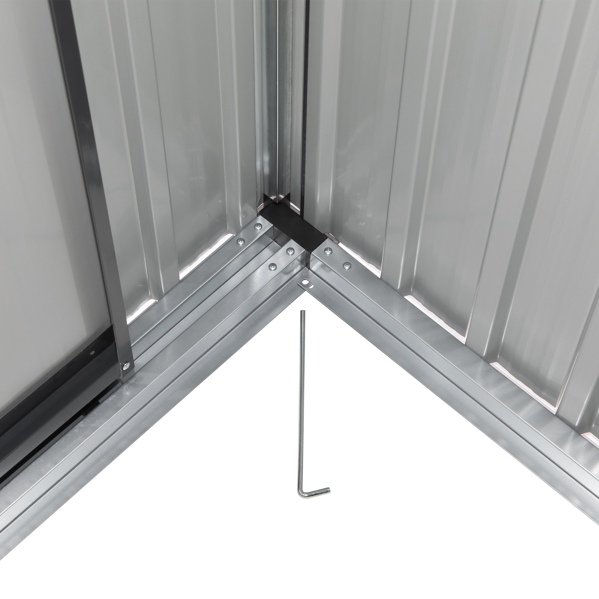 [All-Weather Metal Shed]: Made of heavy-duty galvanized plates and tubes, enhanced with top beams, iron fixed kits, and ground pegs, this storage house ensures excellent firmness and high stability, protecting your items from rain, sun, wind, and snow.