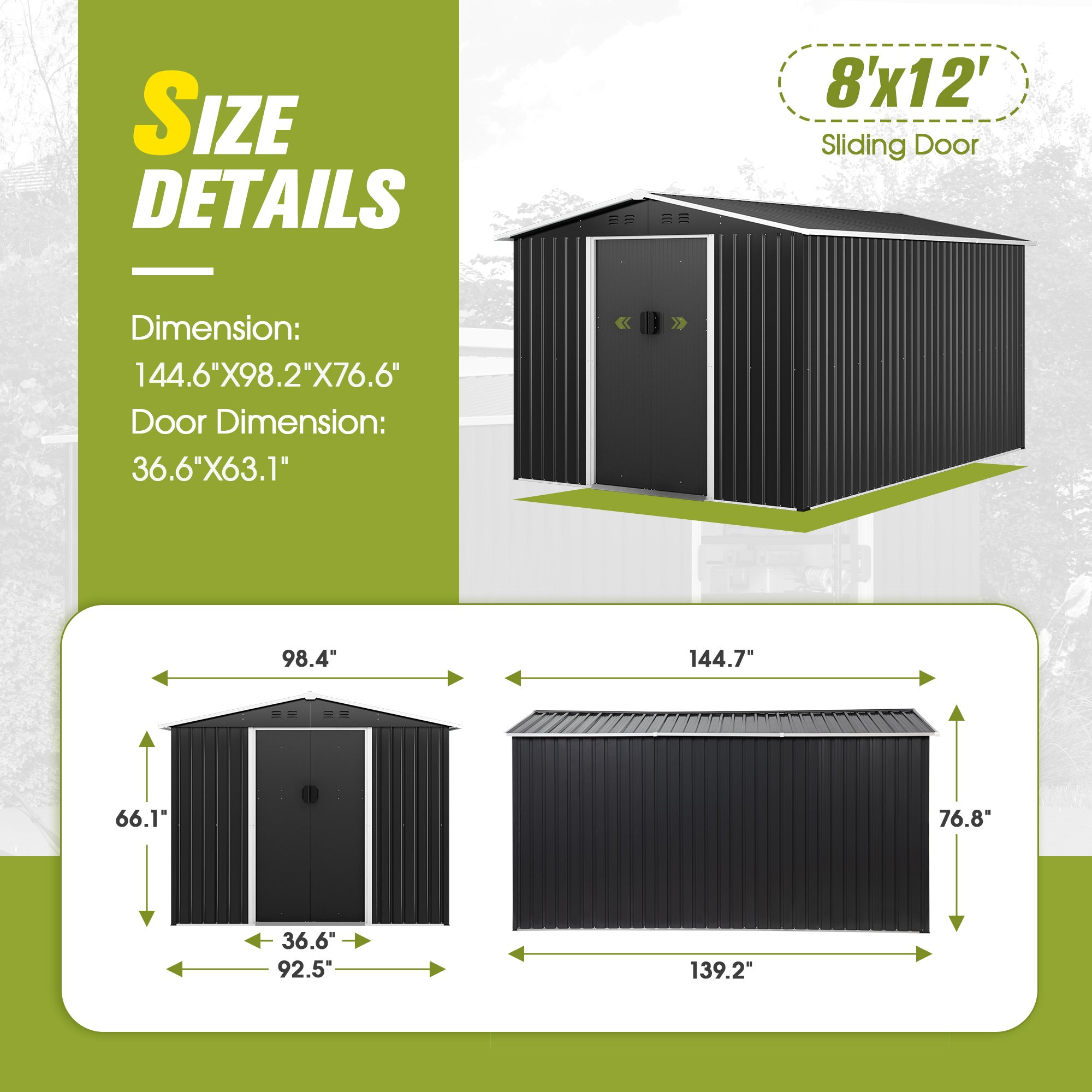 Home > 8 x 12 Ft Outdoor Storage Shed, Metal Garden Shed w/ Lockable Sliding Doors, Vents, Large Tool House for Backyard Patio Lawn, Carbon Black