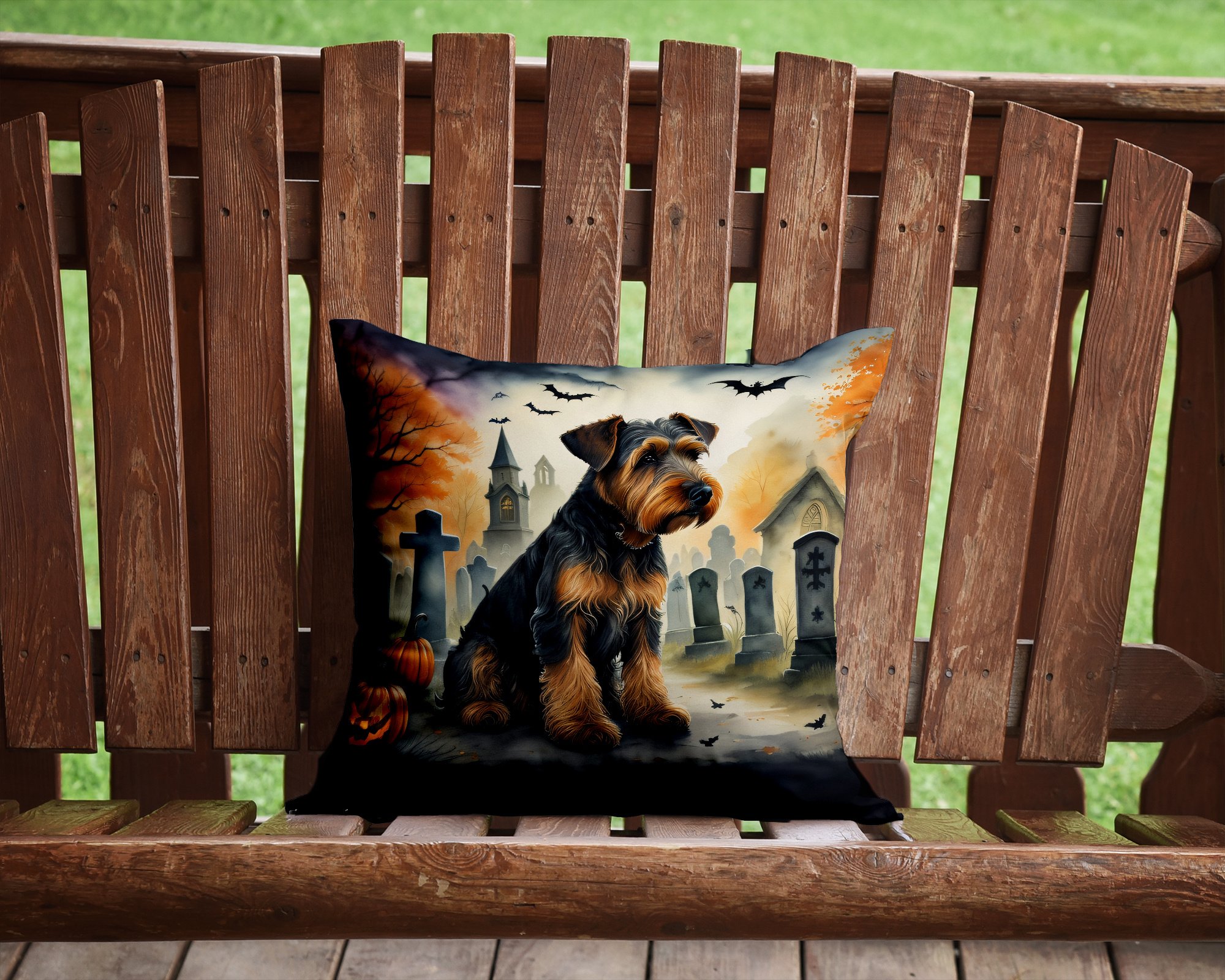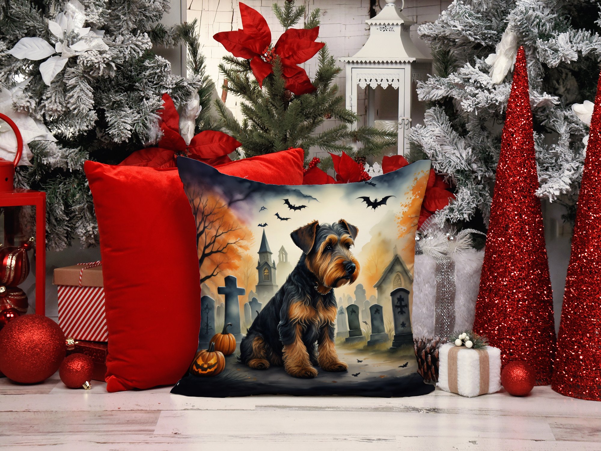 Airedale Terrier Spooky Halloween Throw Pillow Machine Washable, Indoor Outdoor Decorative Pillow for Couch, Bed or Patio, 14Hx14W