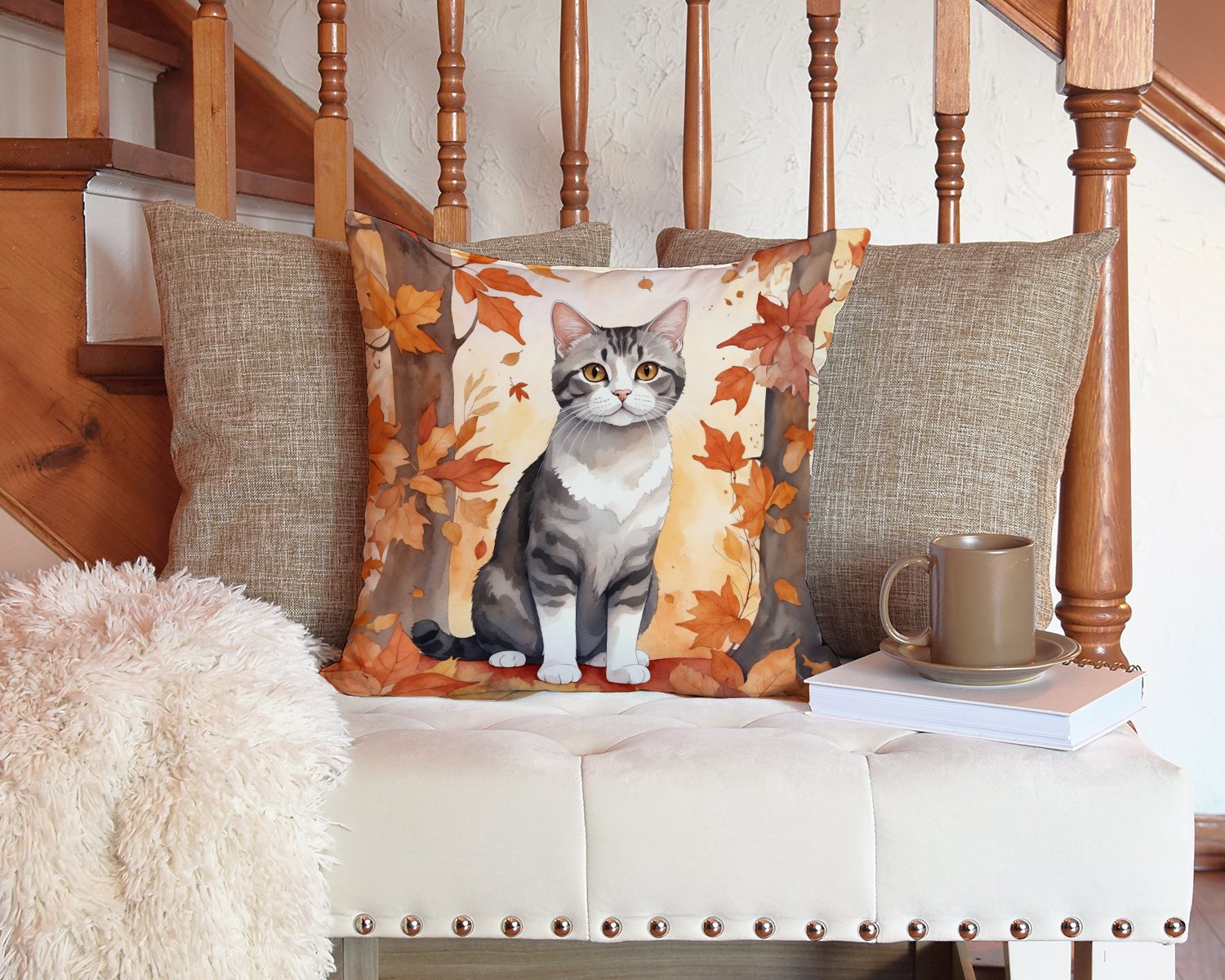 American Wirehair Cat in Fall Leaves Throw Pillow Machine Washable, Indoor Outdoor Decorative Pillow for Couch, Bed or Patio, 14Hx14W