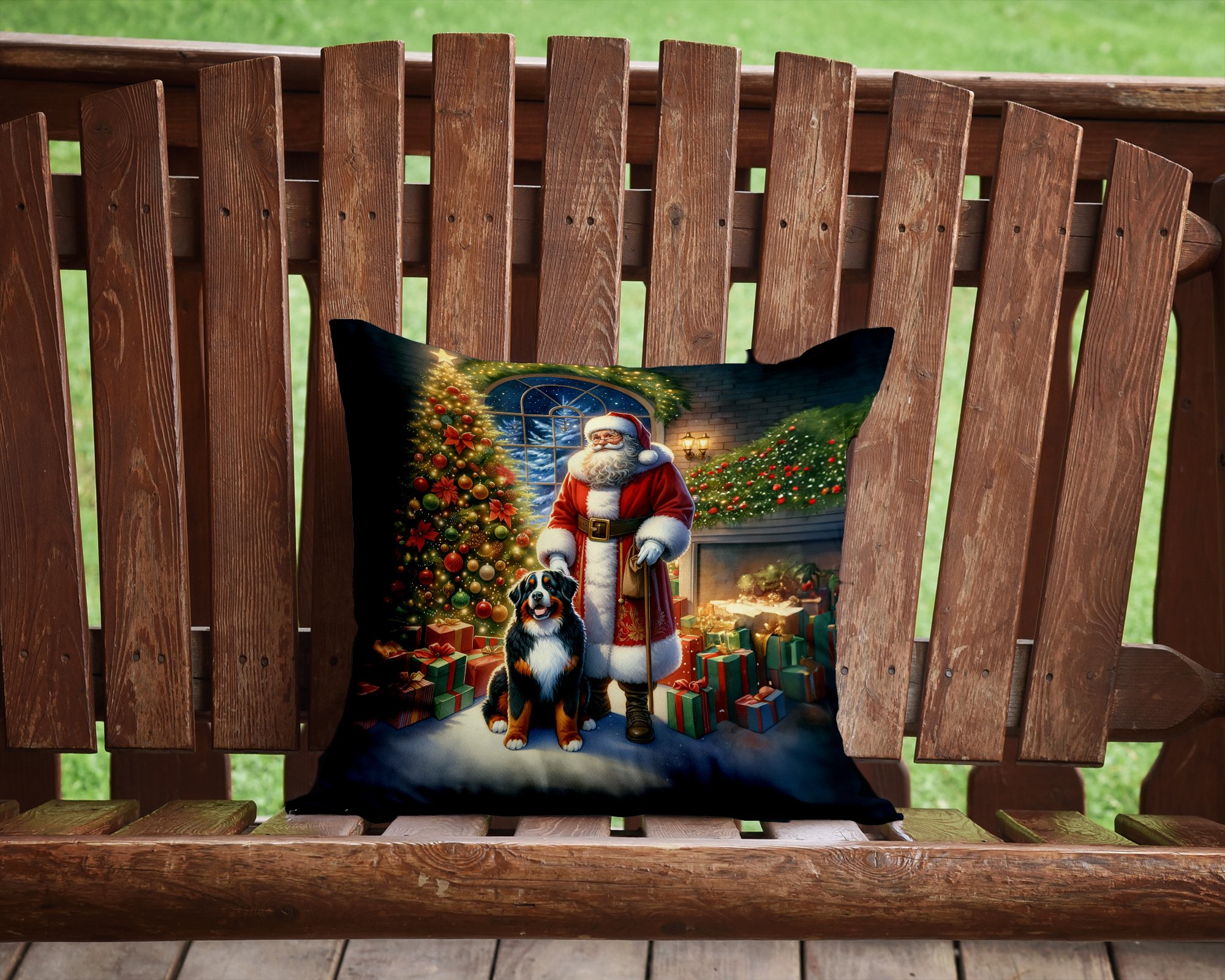 Throw Pillow featuring breed specific Bernese Mountain Dog artwork. Celebrate Christmas with this Christmas Pillow. Add a touch of vibrancy and comfort to your outdoor seating with Caroline's Treasures Fabric Decorative Pillow. Measuring approximately 14 inches by 14 inches, this outdoor pillow is crafted to elevate the appeal of your patio furniture, infusing it with vivid color and artistic flair. The pillow includes a 100% Polyester Fabric sham filled with a quality pillow form to provide superior comfort. Innovatively made from our brand new material, specifically woven for its water resistance, this pillow is designed for durability. The soft canvas fabric offers versatility in use, fit for your indoor couch or your outdoor patio, porch, or veranda. The fabric is dyed with colorfast dyes built for resilience against weather conditions, ensuring the pillow retains its beauty over time. Constructed by sewing three fabric pieces to create a sham, the polyester insert is then nestled inside to form the pillow, resulting in an overstuffed pillow that maintains its shape. Both the sham and the pillow insert are proudly made in the United States. As the pillows are handcrafted, there may be minor variations in size, further enhancing their unique charm. Experience comfort in style with Caroline's Treasures Fabric Decorative Pillow.