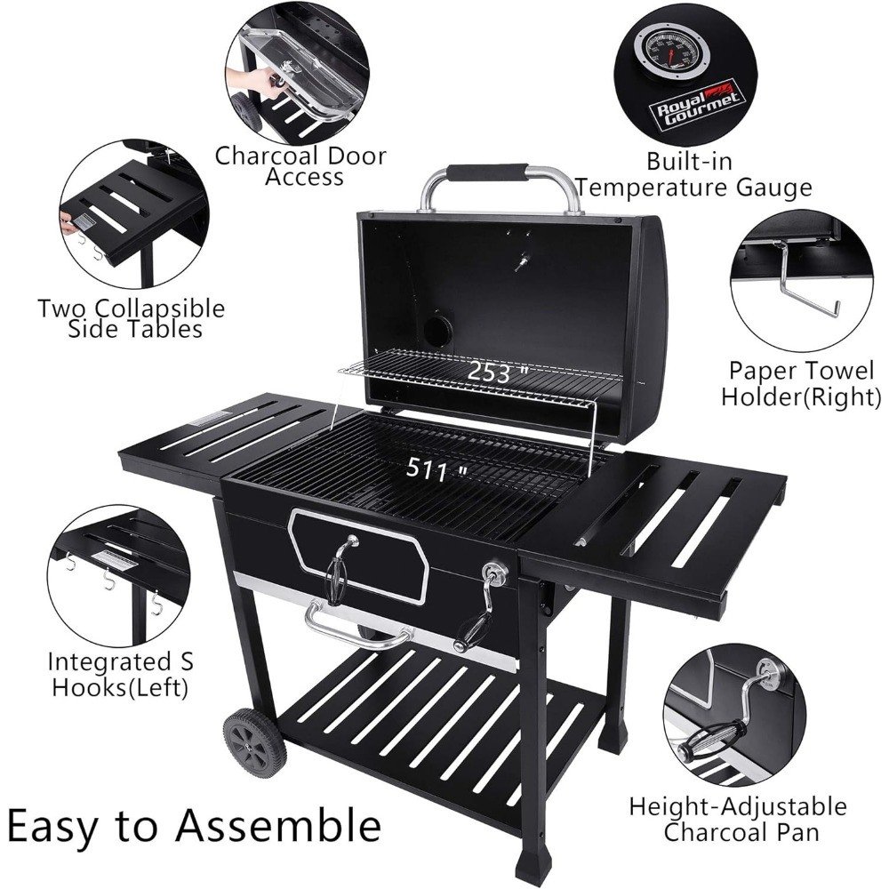 Easy Adjustable Charcoal Pan: Height-adjustable charcoal pan with an easy-to-handle crank handle fine-tunes temperature control and cooks food efficiently. It can hold charcoal up to 3.4 kg/7.5 lb.