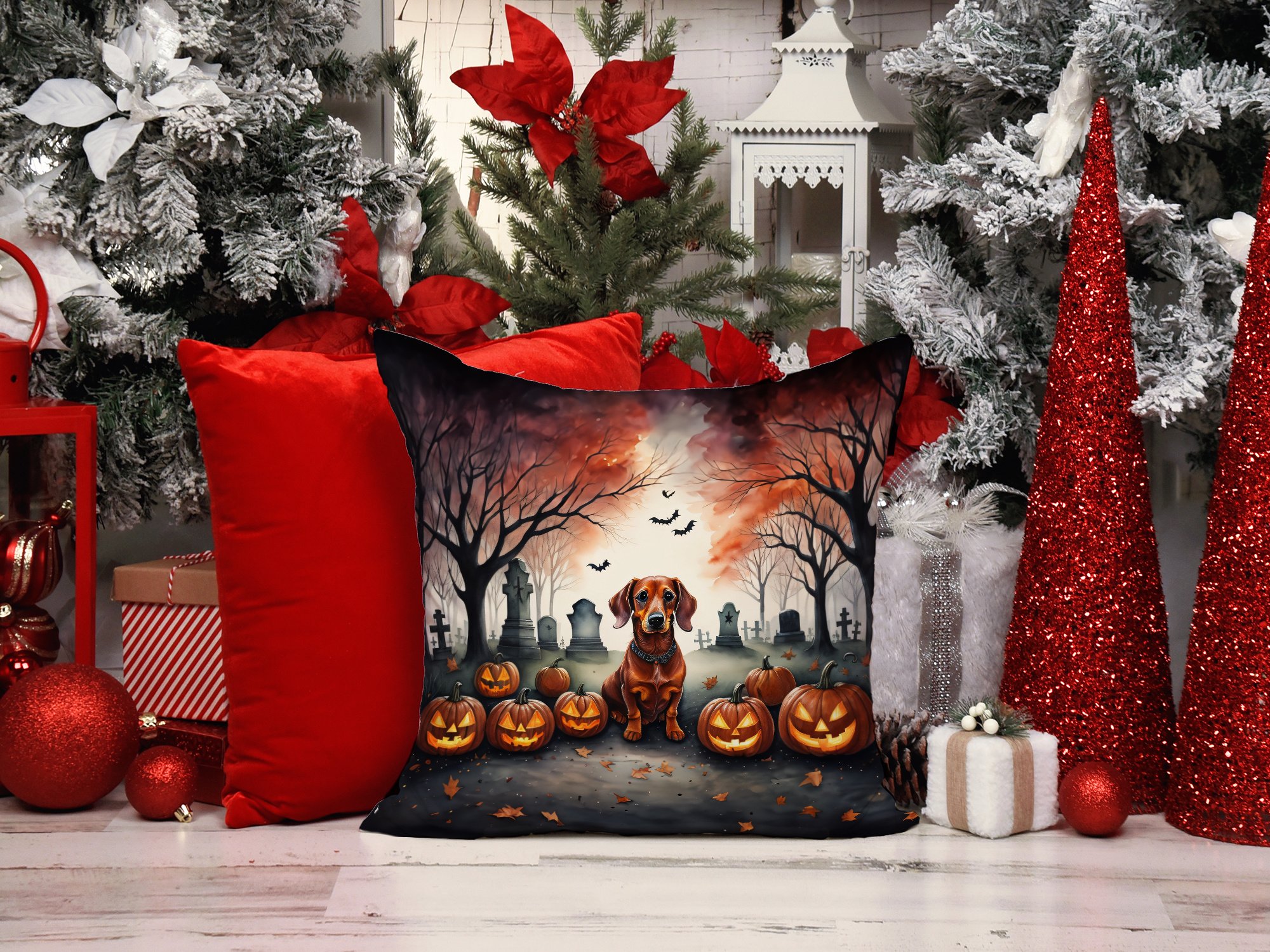 Throw Pillow featuring breed specific Dachshund artwork. Celebrate Halloween with this Halloween Pillow. Add a touch of vibrancy and comfort to your outdoor seating with Caroline's Treasures Fabric Decorative Pillow. Measuring approximately 14 inches by 14 inches, this outdoor pillow is crafted to elevate the appeal of your patio furniture, infusing it with vivid color and artistic flair. The pillow includes a 100% Polyester Fabric sham filled with a quality pillow form to provide superior comfort. Innovatively made from our brand new material, specifically woven for its water resistance, this pillow is designed for durability. The soft canvas fabric offers versatility in use, fit for your indoor couch or your outdoor patio, porch, or veranda. The fabric is dyed with colorfast dyes built for resilience against weather conditions, ensuring the pillow retains its beauty over time. Constructed by sewing three fabric pieces to create a sham, the polyester insert is then nestled inside to form the pillow, resulting in an overstuffed pillow that maintains its shape. Both the sham and the pillow insert are proudly made in the United States. As the pillows are handcrafted, there may be minor variations in size, further enhancing their unique charm. Experience comfort in style with Caroline's Treasures Fabric Decorative Pillow.