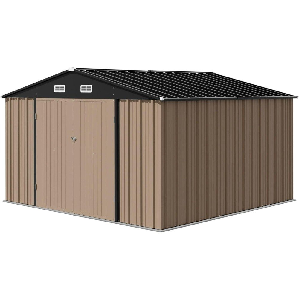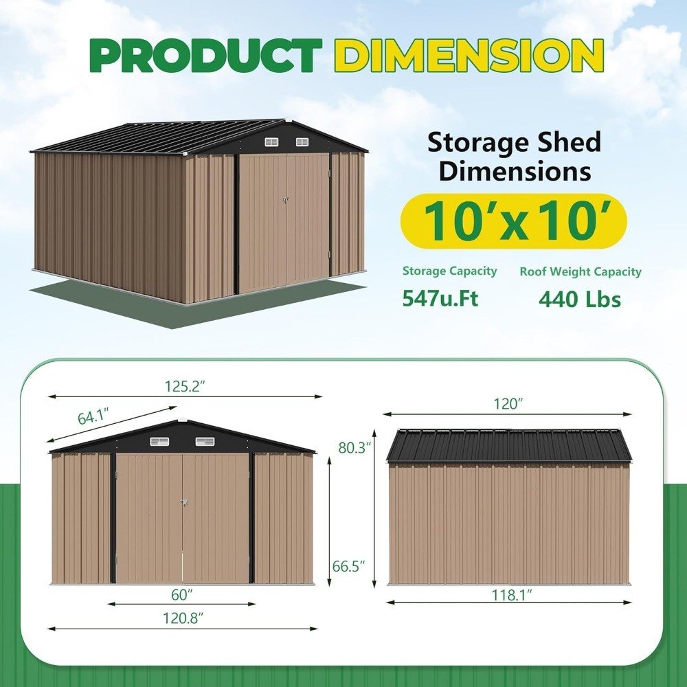 Compared to traditional storage sheds available on the market, the 10x10 FT outdoor shed provides a larger area for storage, allowing you to accommodate everything you want to store. This storage shed is made of high-grade metal, which has waterproof and UV-resistant properties. The thick material structure provides protection for the product's all-weather use, even in harsh weather conditions. The shed provides ample storage space to accommodate various gardening tools and large outdoor equipment, allowing your backyard garden to stay spacious and organized.