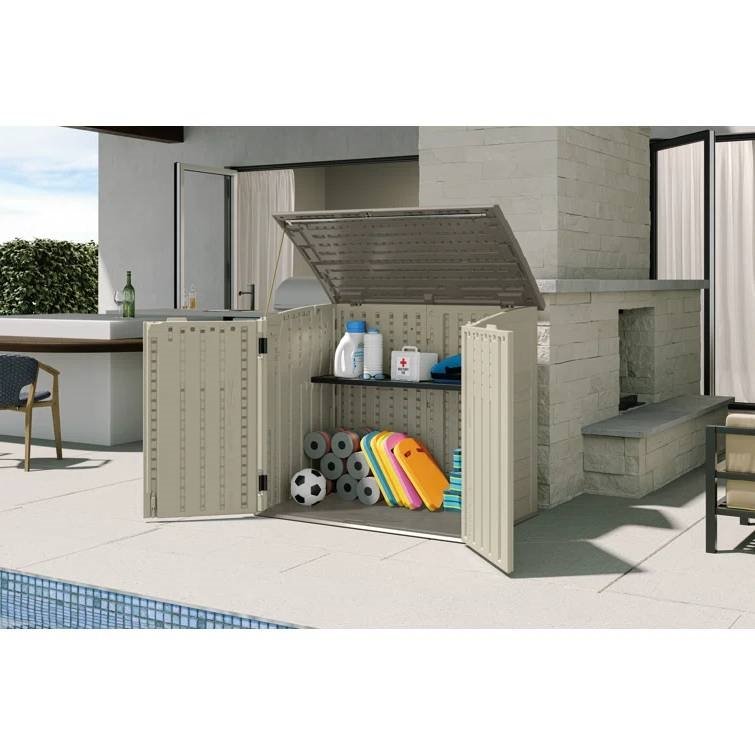 This Cream Beige and Grey Outdoor Heavy Duty Plastic Garbage Bin Trash Can Storage Shed can handle any of your outdoor organizational needs. Ideal for stowing garbage cans, lawn and garden products, snow blowers, bicycles, and more, this stylish storage solution is essential in every season. Additional features include durable, multi-wall resin construction for year-round strength and stability, a reinforced floor for heavier items, a 3-door locking system for added security, and a sleek, low-profile design that fits neatly in many spaces.