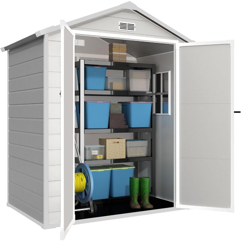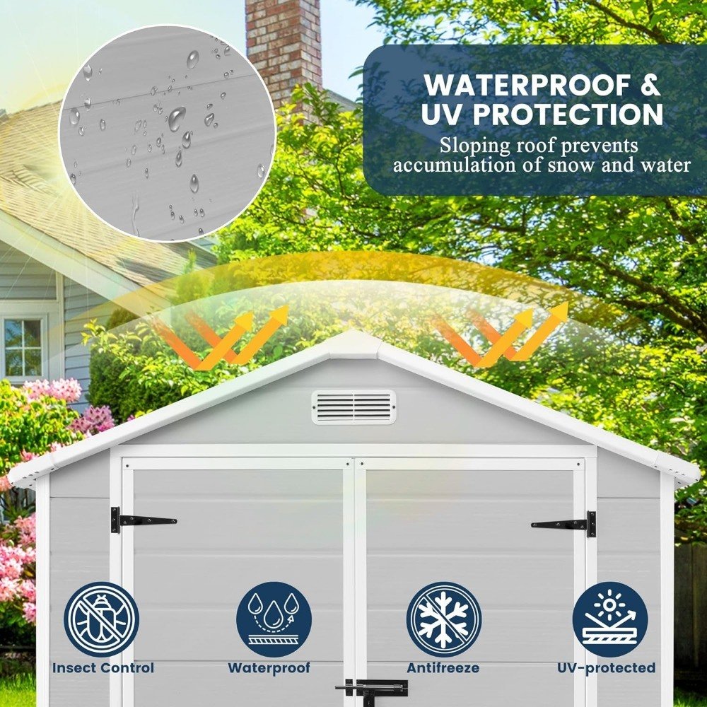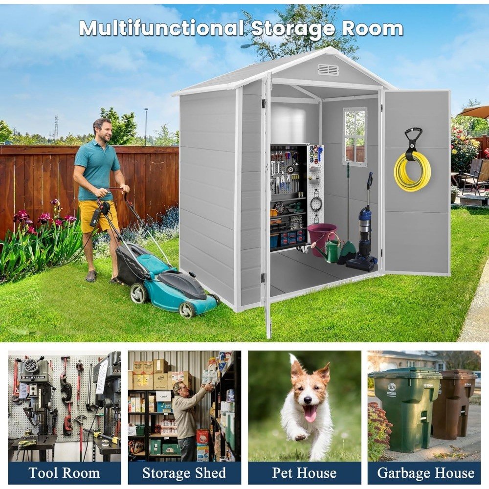 [Large Size]: This resin shed has a generous size of 6*4.4ft, which means you can store a lot of items inside. Whether you need to keep your gardening tools, lawn equipment, bicycles, or other outdoor items, this shed can accommodate them easily. You can also organize your belongings with shelves and hooks (not included) to make the most of the space. This shed will help you declutter your yard and garage and keep your things safe and dry.[Easy and Quick Installation]: This shed house comes with detailed instructions and all resin panels already labeled. Two people are required to install together. Arranging the resin boards first according to labels will make the installation process easier. The shed features pre-cut and pre-drilled pieces that fit together easily.[Strong and Durable Material]: This outdoor shed is made of high-quality resin material, which is strong and durable. Unlike metal or wood sheds, this shed will not rust or discolor over time. It is also resistant to corrosion, insects, and rotting. It can withstand harsh weather conditions, such as rain, snow, sun, and wind, without fading or cracking. It is also waterproof and UV-proof, so you don't have to worry about leaks or damage from the sun.[Practical Design]: This resin storage cabinet with floor has a practical design that makes it easy to use and attractive to look at. It has a sloping roof that prevents water accumulation and snow buildup on the top. It also has enlarged windows that allow natural light and ventilation inside the shed. The double doors can be opened wide for easy access and locked for security. The fixed floor keeps the shed stable and protects the contents from moisture and dirt.[Multi-functional Use]: This resin storage shed is not just a storage unit, but also a versatile structure that can serve different purposes. You can use it as an outdoor tool house, where you can store and access your tools conveniently. You can also use it as a garbage house, where you can keep your trash cans out of sight and smell. Or you can use it as a pet house, where you can provide a comfortable shelter for your dogs, cats, or other animals. Whatever you need, this shed can fulfill it.