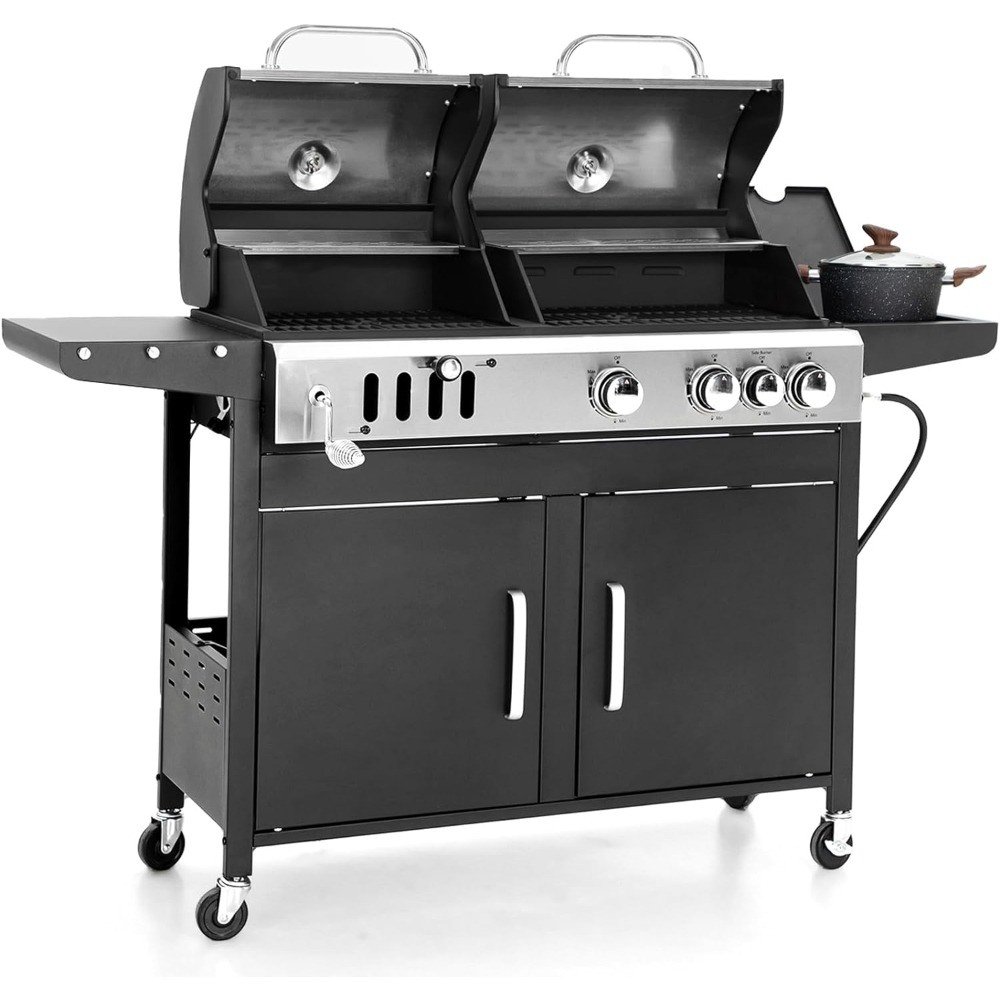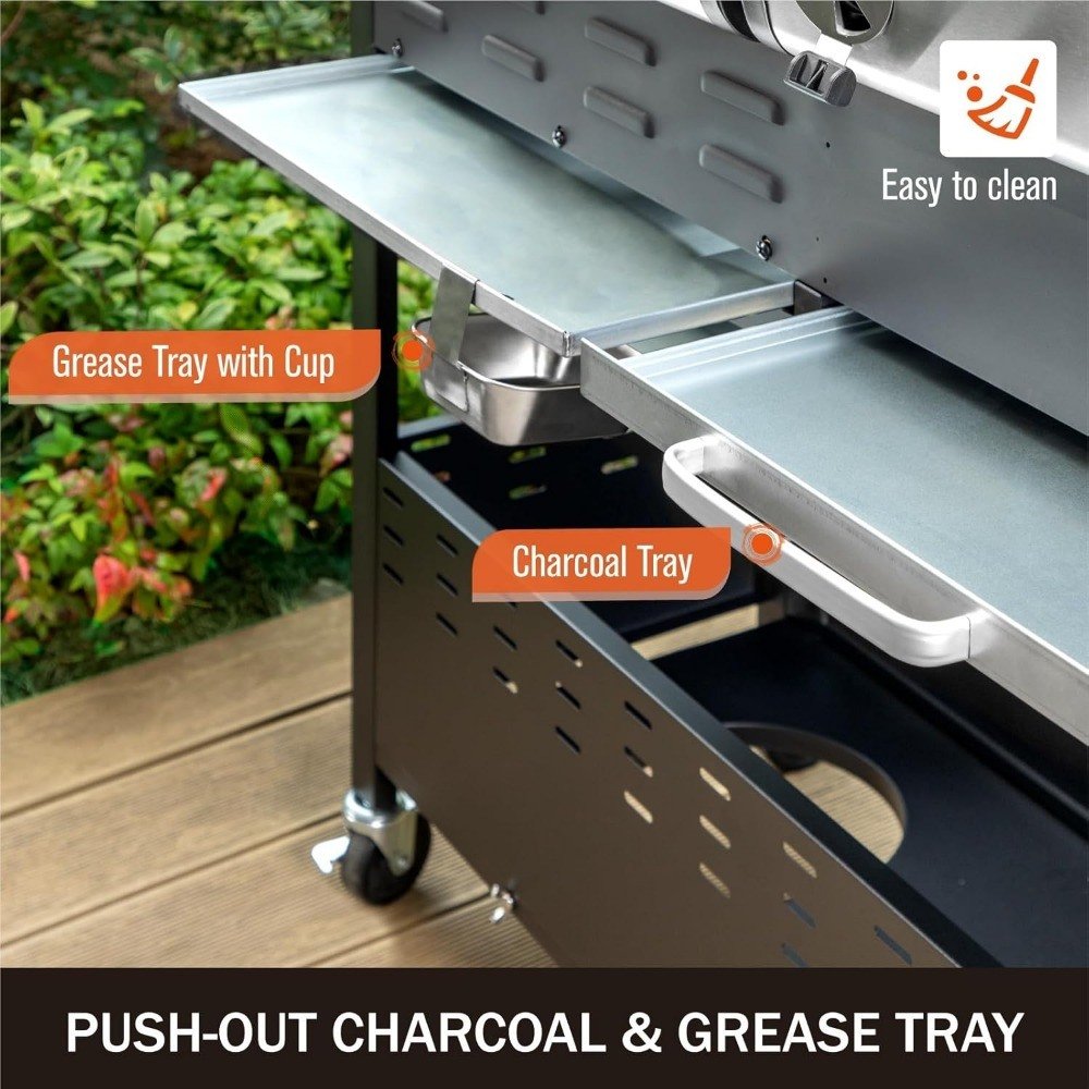 [Gas & Charcoal Grill Combo]Dual fuel grills allow you to choose between charcoal and gas, giving you the flexibility to cook with the fuel source that best suits your needs. This BBQ grills have separate cooking zone, allowing you to simultaneously cook different types of food or at varying temperatures, Charcoal imparts a smoky flavor, while gas provides quick and precise heat control, making it suitable for large gatherings.[Porcelain-Enameled Cast Iron Grates]Cooking grates of BBQ grill are made of durable, easy-to-clean porcelain-enameled cast iron material which helps prevent rusting and cracking. Stainless steel burners, porcelain-enamel cast iron cooking grates and porcelain-enamel flame tamer of Gas cooking zone work together to distribute even heat across the entire grilling surface and superior heat retention, preventing hot or cold spots on grates.[690 SQ.IN. Cooking Space]Features a spacious cooking area with 520 square inches of primary cooking space on porcelain-enameled cast iron grates and an additional 170 square inches on a stainless steel warming rack. Provides a total of 690 square inches BBQ cooking space that serves to a large gatherings or parties. There is lots of counter space and places to hang your grilling tools.[Easy Cleaning]Full-size push out ash tray is removable for quick and easy clean-up ashes and the grease tray slides out smoothly, making it a breeze to deal with grease and drippings while you're grilling. Plus, the handy cup lets you easily get rid of the collected grease, keeping the post-grill cleanup hassle-free.[Dimension & Warranty]Outdoor grill dimensions - 23"D x 61"W x 46"H | Weight: 105 lbs | The height of the cooking space(from grill to top of closed lid) - 10". Barbeque grill works with standard 20 lb LP tank(not included). hose & regulator included.Dual Fuel Gas and Charcoal GrillCast Iron Grates & Extra Storage AreaDurable Porcelain-Enameled Cast Iron GratesHeat-evenly & excellent heat retention.Extra Storage AreaIn addition to storing gas tanks, you can also store some foods, grill tools, etcCHARCOAL SIDECrank HandleEasy to adjust the heat for the charcoal with the crank handle.Adjustable Charcoal TrayYou can raises and lowers the charcoal tray to your needs.Adjustable Air Vent & DamperEnhance air circulation, ensuring minimal heat loss without the need to open the lid.Side Prep Table with HooksSide shelves offer ample work and prep space, you can also hooks for grill tools.GAS SIDE3 Stainless Steel Burner3 Stainless steel burners provide total 28,650 BTU, delivering all the power you'll need. Durable for longer-lasting performance.Porcelain-Enamel Flame TamerPorcelain-enamel flame tamer work together to distribute even heat across the entire grilling surface and superior heat retentionAdjusatble Flame Control KnobElectronic ignition system offers fast startups with the push of a button, you can adjust flame to your needs.8,530 BTU Side BurnerUse the side burner to simmer BBQ sauce or saute veggies while the main course grills under the lid.