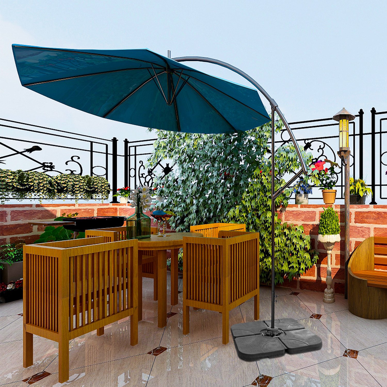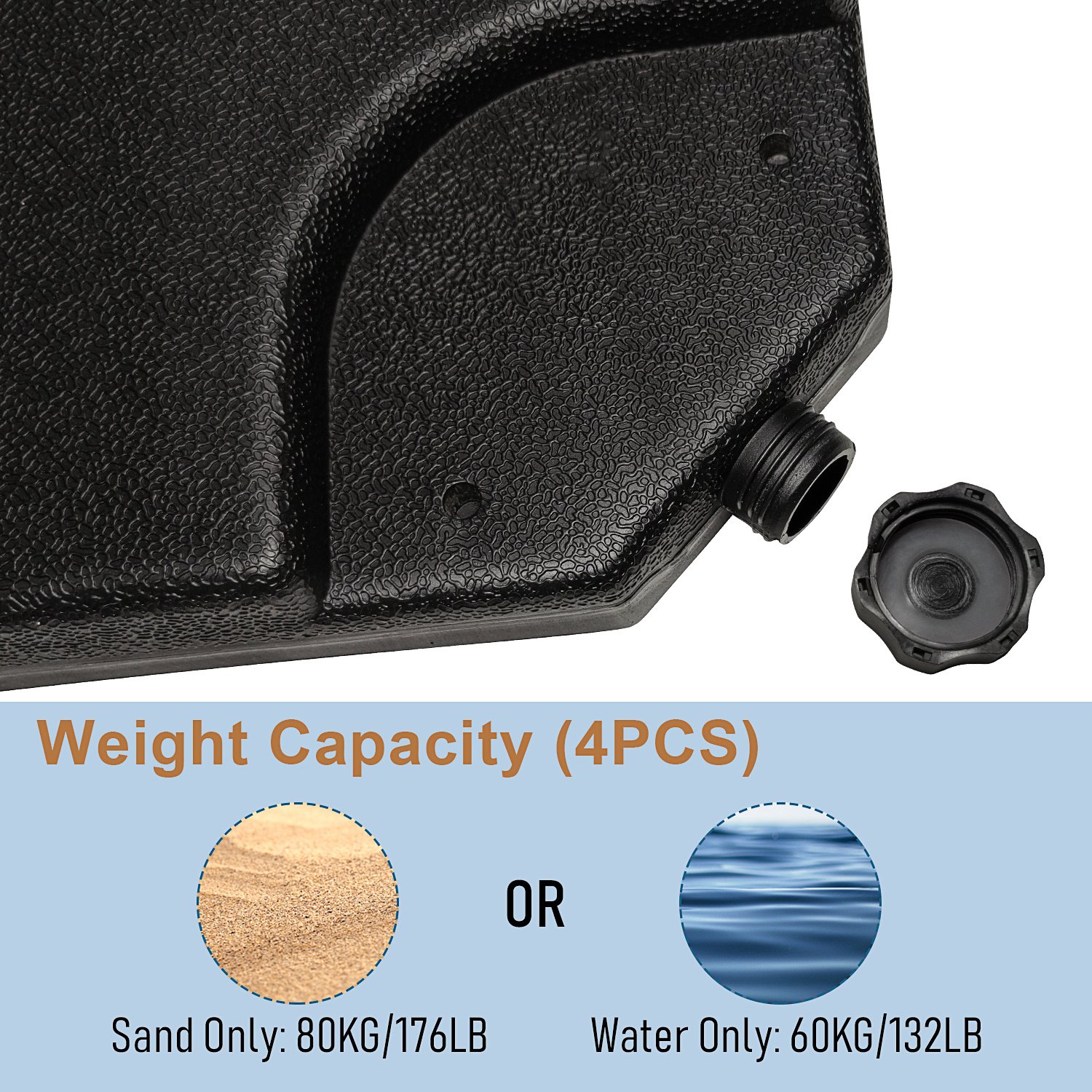 • Weight capacity (4-piece): the 4-plate can be filled with 60 kg/132 lbs. water or 80 kg/176 lbs. sand, provide enough weight support for your offset umbrella