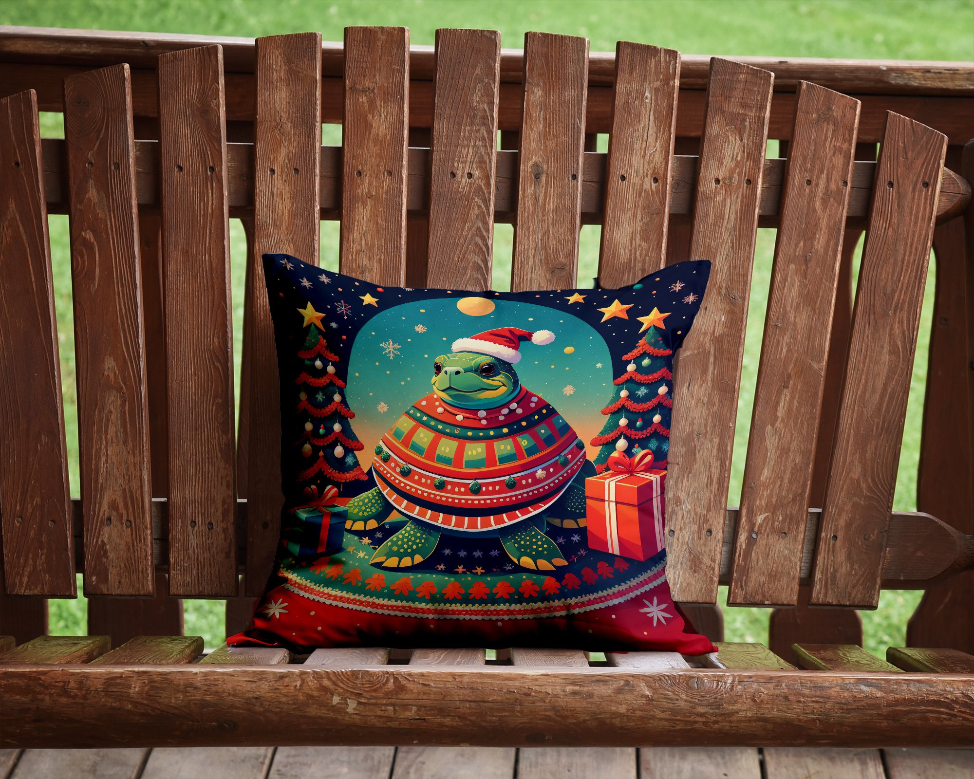 Throw Pillow featuring breed specific Turtle artwork. Celebrate Christmas with this Christmas Pillow. Add a touch of vibrancy and comfort to your outdoor seating with Caroline's Treasures Fabric Decorative Pillow. Measuring approximately 14 inches by 14 inches, this outdoor pillow is crafted to elevate the appeal of your patio furniture, infusing it with vivid color and artistic flair. The pillow includes a 100% Polyester Fabric sham filled with a quality pillow form to provide superior comfort. Innovatively made from our brand new material, specifically woven for its water resistance, this pillow is designed for durability. The soft canvas fabric offers versatility in use, fit for your indoor couch or your outdoor patio, porch, or veranda. The fabric is dyed with colorfast dyes built for resilience against weather conditions, ensuring the pillow retains its beauty over time. Constructed by sewing three fabric pieces to create a sham, the polyester insert is then nestled inside to form the pillow, resulting in an overstuffed pillow that maintains its shape. Both the sham and the pillow insert are proudly made in the United States. As the pillows are handcrafted, there may be minor variations in size, further enhancing their unique charm. Experience comfort in style with Caroline's Treasures Fabric Decorative Pillow.