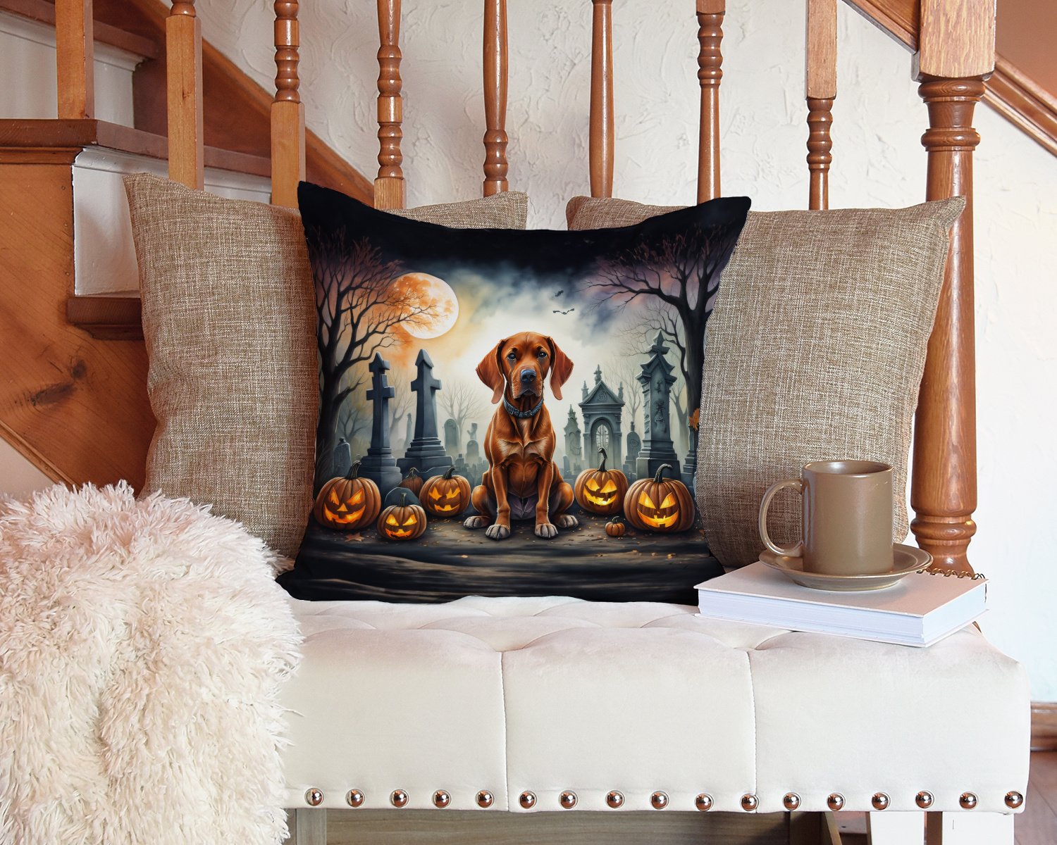 Throw Pillow featuring breed specific Vizsla artwork. Celebrate Halloween with this Halloween Pillow. Add a touch of vibrancy and comfort to your outdoor seating with Caroline's Treasures Fabric Decorative Pillow. Measuring approximately 14 inches by 14 inches, this outdoor pillow is crafted to elevate the appeal of your patio furniture, infusing it with vivid color and artistic flair. The pillow includes a 100% Polyester Fabric sham filled with a quality pillow form to provide superior comfort. Innovatively made from our brand new material, specifically woven for its water resistance, this pillow is designed for durability. The soft canvas fabric offers versatility in use, fit for your indoor couch or your outdoor patio, porch, or veranda. The fabric is dyed with colorfast dyes built for resilience against weather conditions, ensuring the pillow retains its beauty over time. Constructed by sewing three fabric pieces to create a sham, the polyester insert is then nestled inside to form the pillow, resulting in an overstuffed pillow that maintains its shape. Both the sham and the pillow insert are proudly made in the United States. As the pillows are handcrafted, there may be minor variations in size, further enhancing their unique charm. Experience comfort in style with Caroline's Treasures Fabric Decorative Pillow.